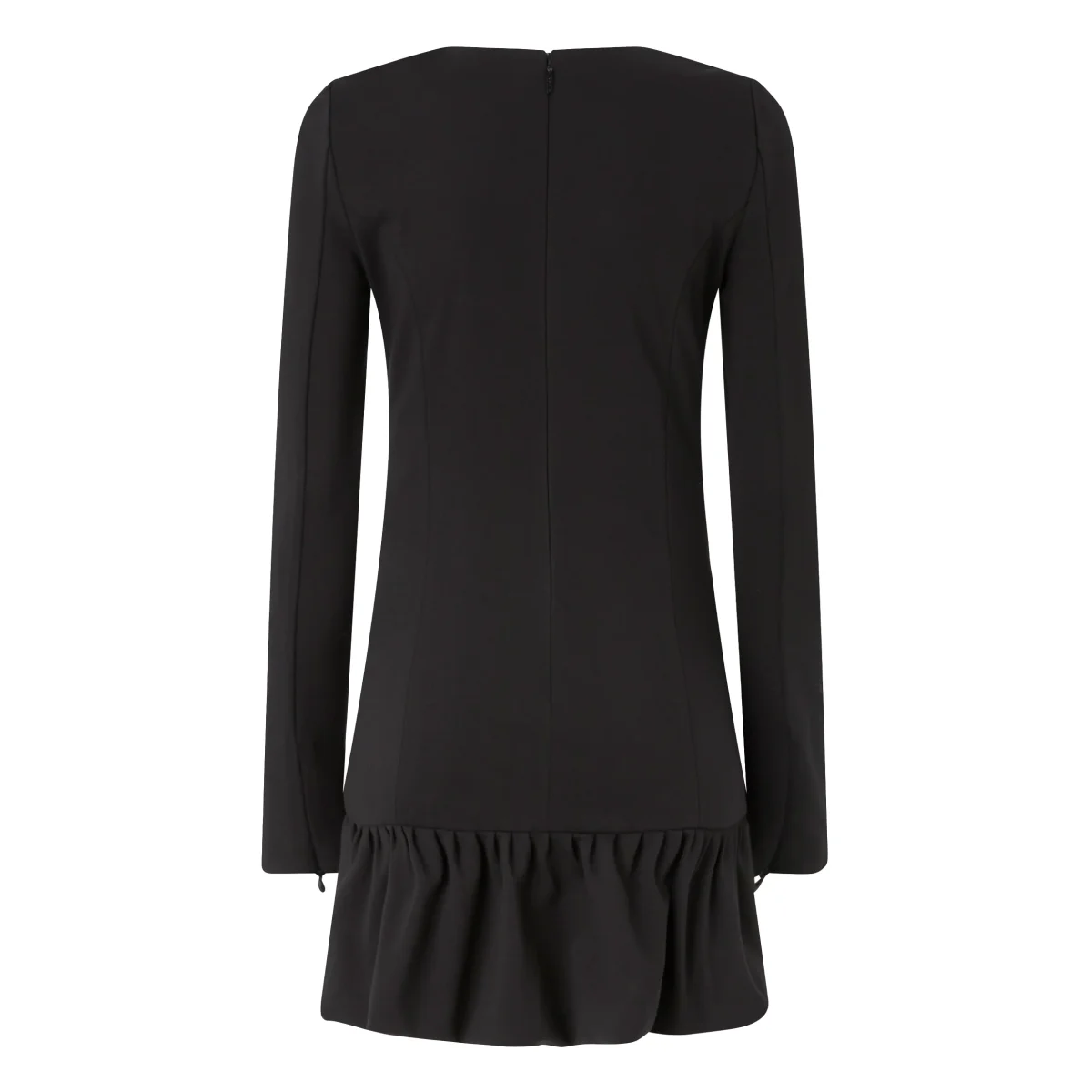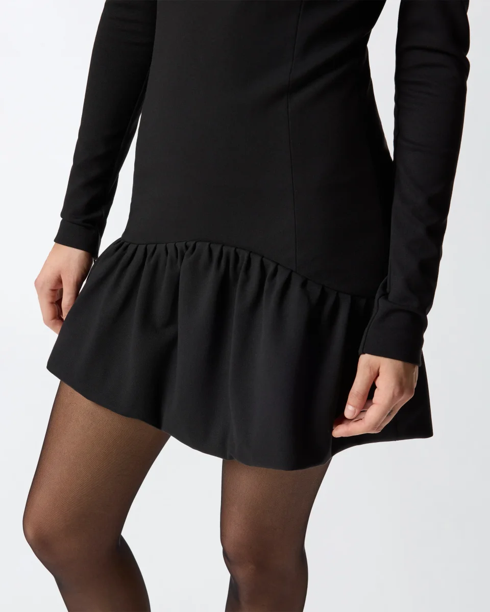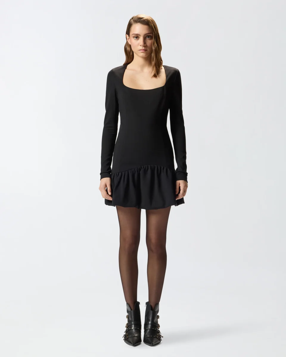 Il collo squadrato amplia lo sguardo sul viso e le maniche lunghe bilanciano la lunghezza del modello. La balza asimmetrica sul fondo introduce un movimento fluido, rendendo l’abito perfetto per serate, eventi e momenti in cui l’eleganza si fa pragmatica.