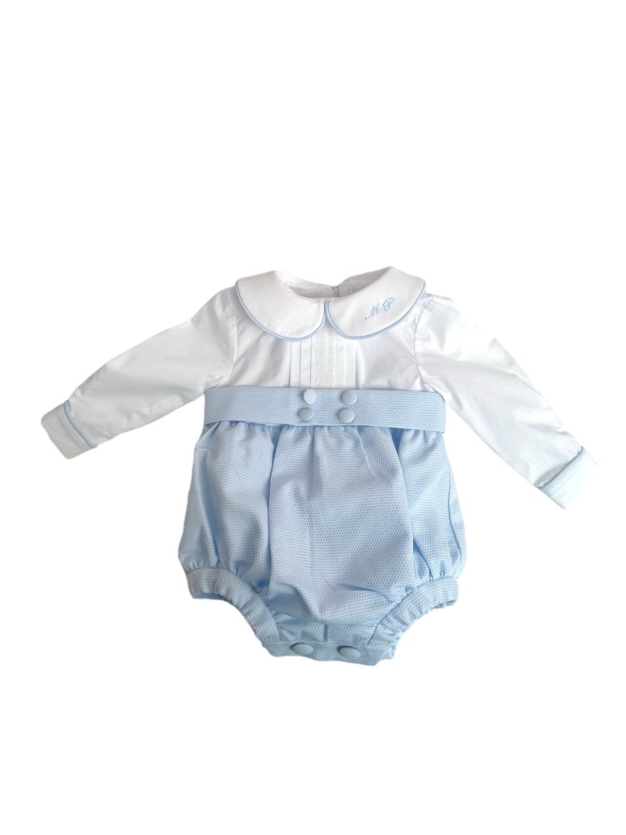 Pagliaccetto intero , parte di sopra in cotone liscio, parte inferiore in piquet nido d’ape , pizzo centrale , cintura rimovibile e personalizzazione sul colletto ( adatto per un battesimo e per un primo compleanno)