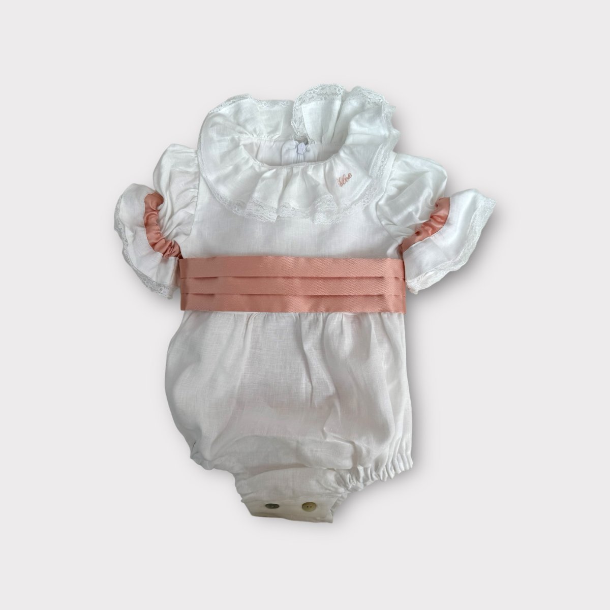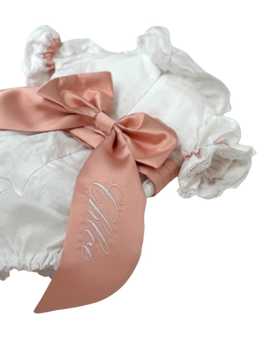 Pagliaccetto in puro lino , collo tondo con pizzo e personalizzazione , cintura plisse in seta con fiocco indietro personalizzato , apertura sotto per facilitare il cambio e apertura indietro con zip invisibile