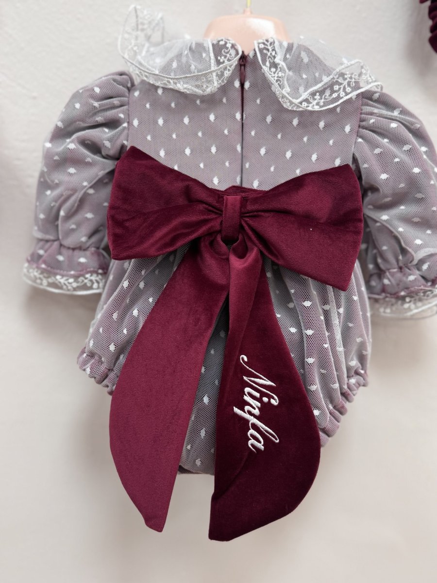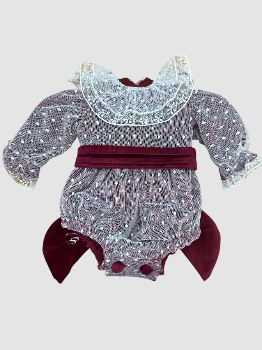 Pagliaccetto in velluto bordeaux con tulle pois bianco collo volant in pizzo e fiocco dietro personalizzato