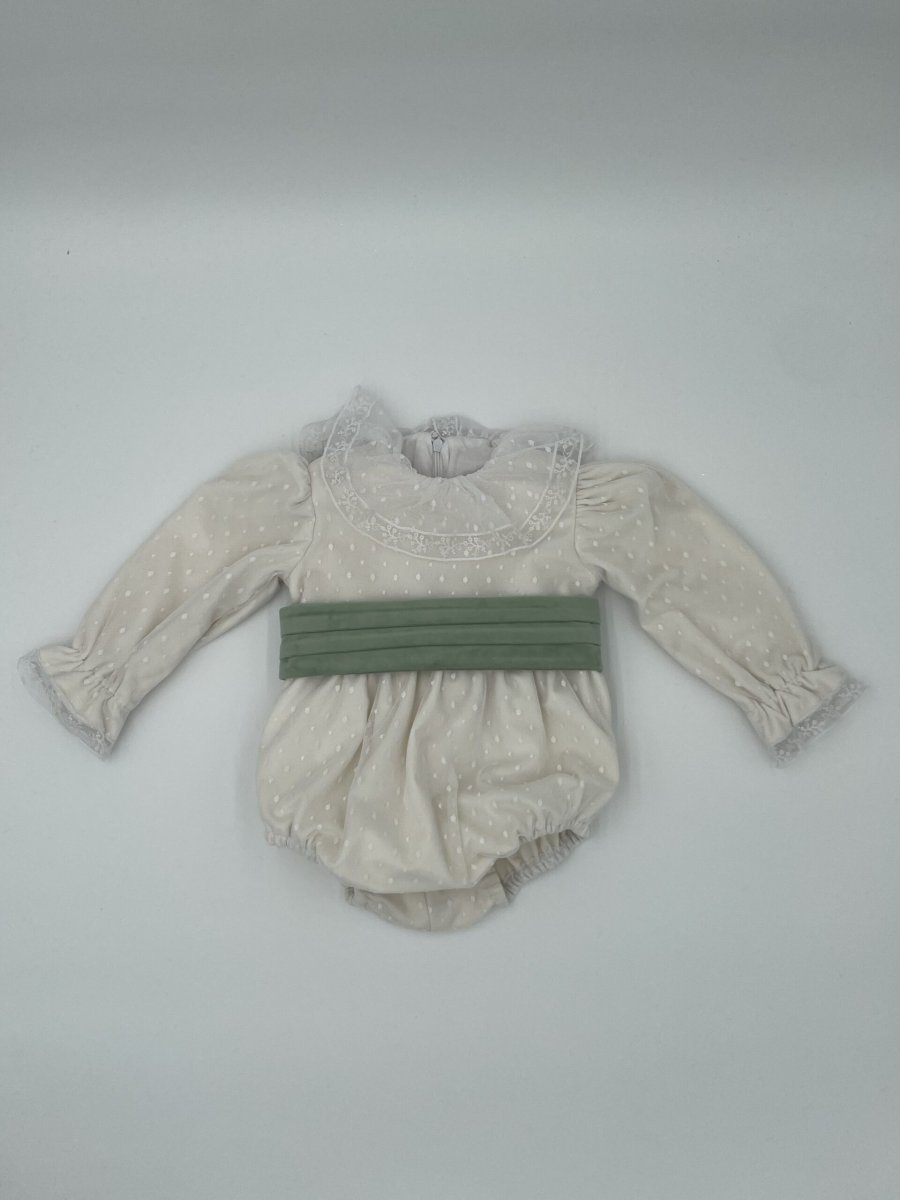 Pagliaccetto in velluto rivestito in tulle pois con cintura verde salvia