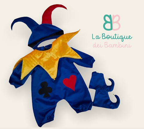 Pagliaccetto Jolly, in tessuto blu in contrasto con il collo giallo, è composto da cuffia e copriscarpe