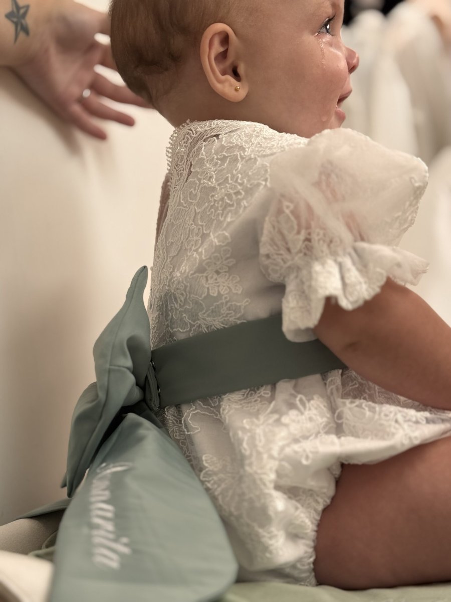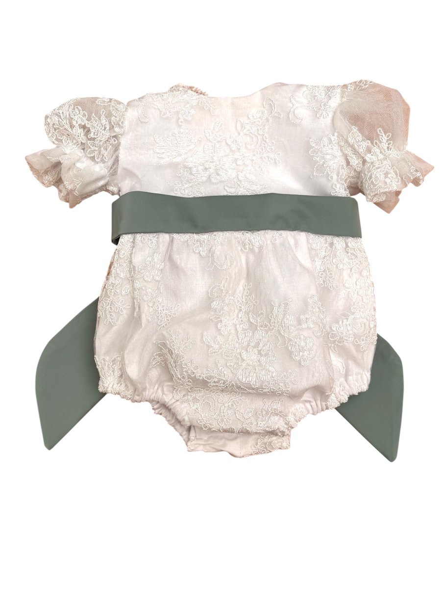 Pagliaccetto In pizzo Grace con cintura verde e fiocco personalizzato