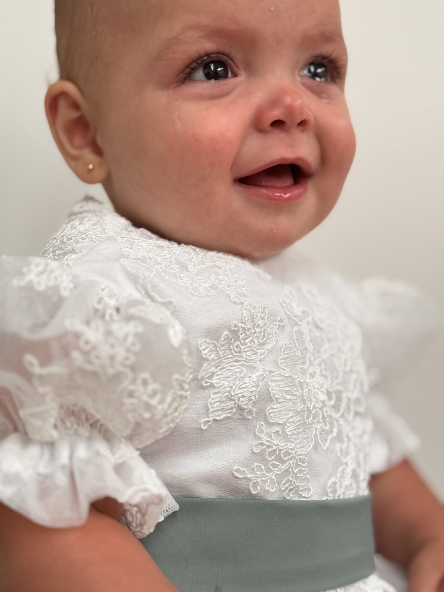 Pagliaccetto In pizzo Grace con cintura verde con fiocco personalizzato