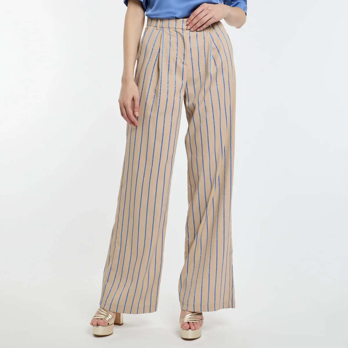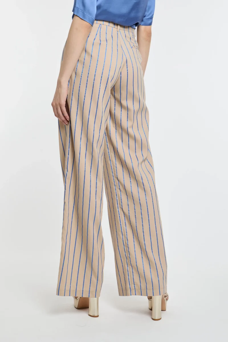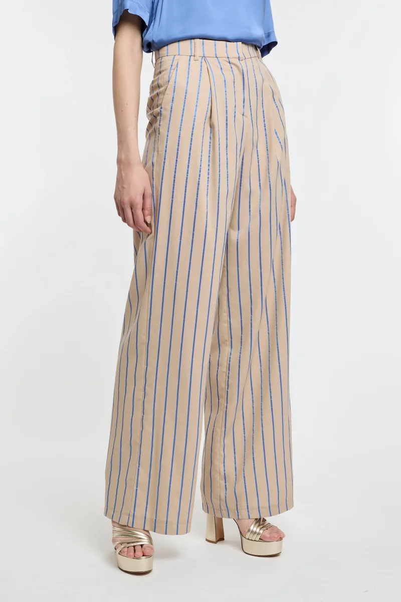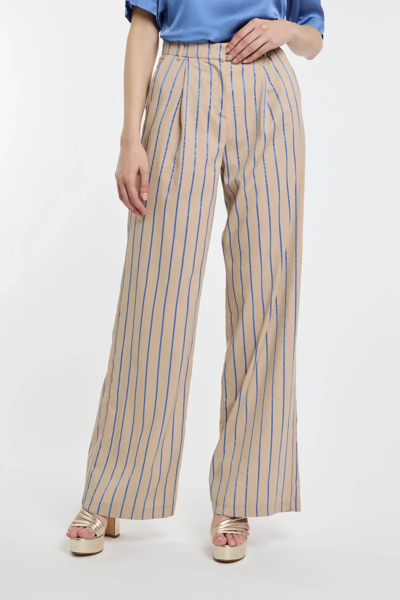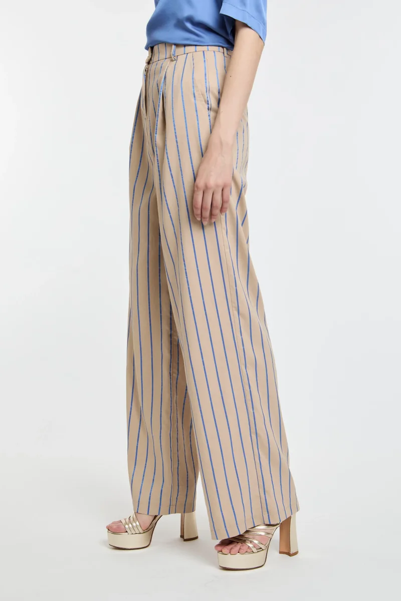 Pantalone a palazzo Kaos in viscosa con righe bluette a contrasto.