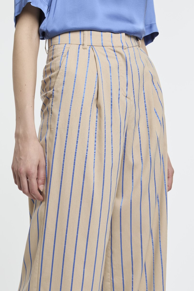 Pantalone a palazzo Kaos in viscosa con righe bluette a contrasto.# Tasche davanti.# Tasca singola dietro a filo.# Vestibilità: regular.# Composizione: 82% viscosa, 12% poliammide, 6% poliestere.