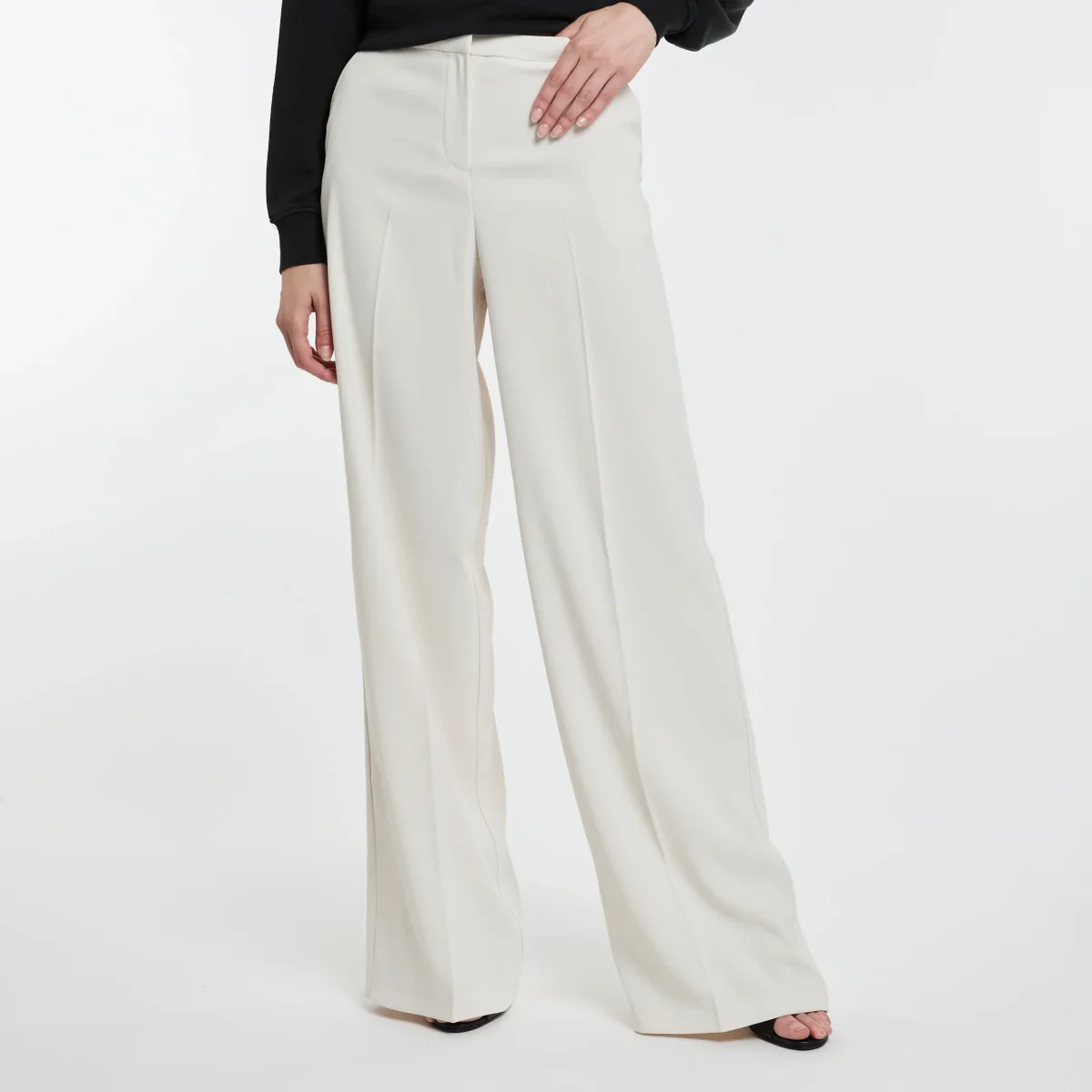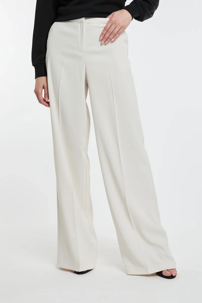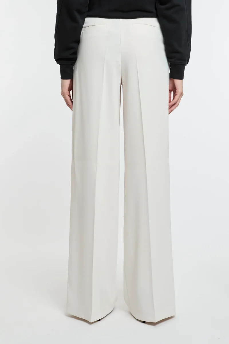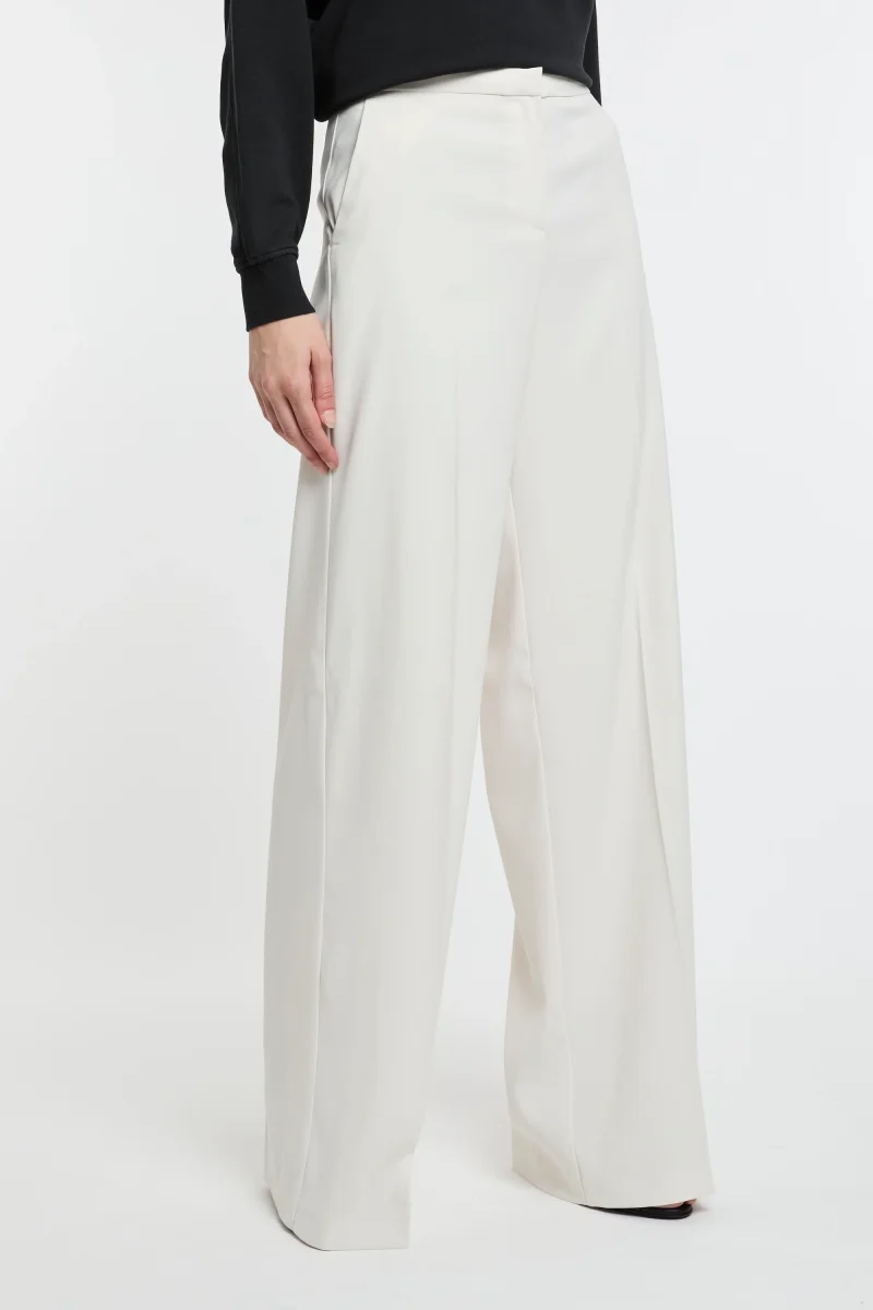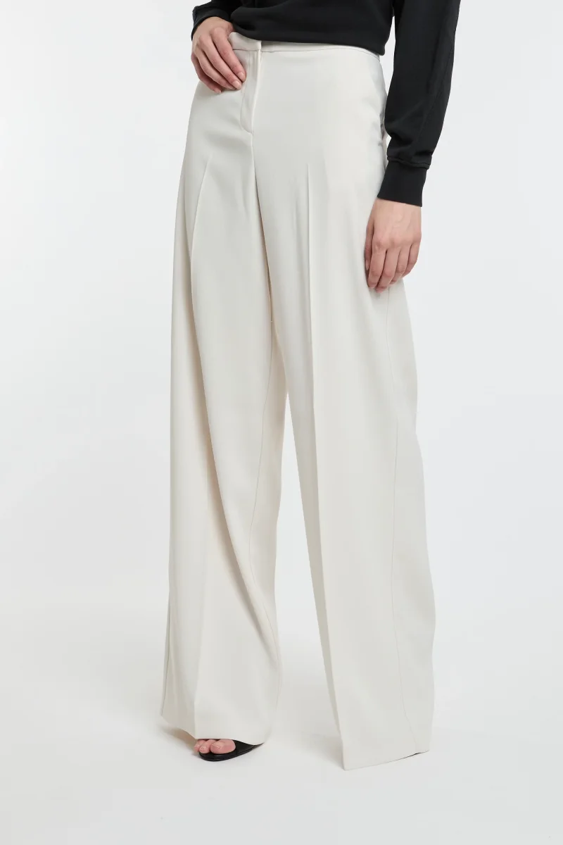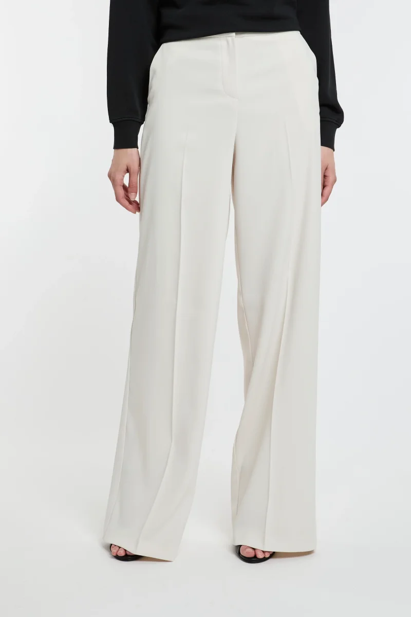 Pantaloni wide leg in leggero tessuto crêpe stretch. Vita regular con tasche alla francese sui fianchi e a filetto sul retro, gamba dalla linea ampia a palazzo. Chiusura con zip.