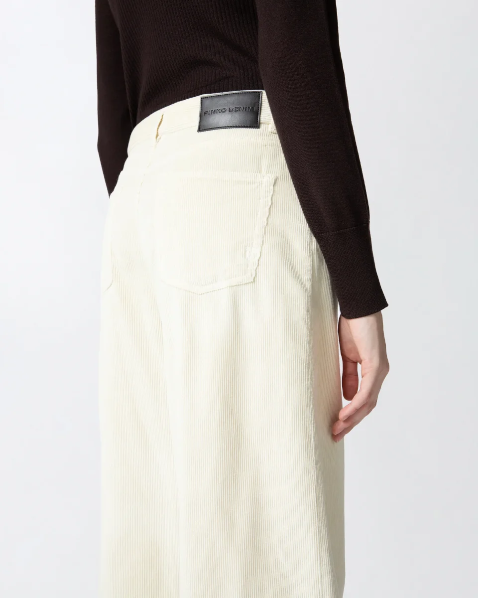 Pantalone lungo cinque tasche a palazzo Pinko con gamba ampia realizzato in velluto a coste sottili. # Vita alta con passanti per cintura e chiusura con bottone a chiodo in metallo e zip.# Tasca americana davanti.# Tasca toppa su retro.# Composizione: 78% cotone, 20% modal, 2% elastan.# Composizione fodera: 100% cotone.