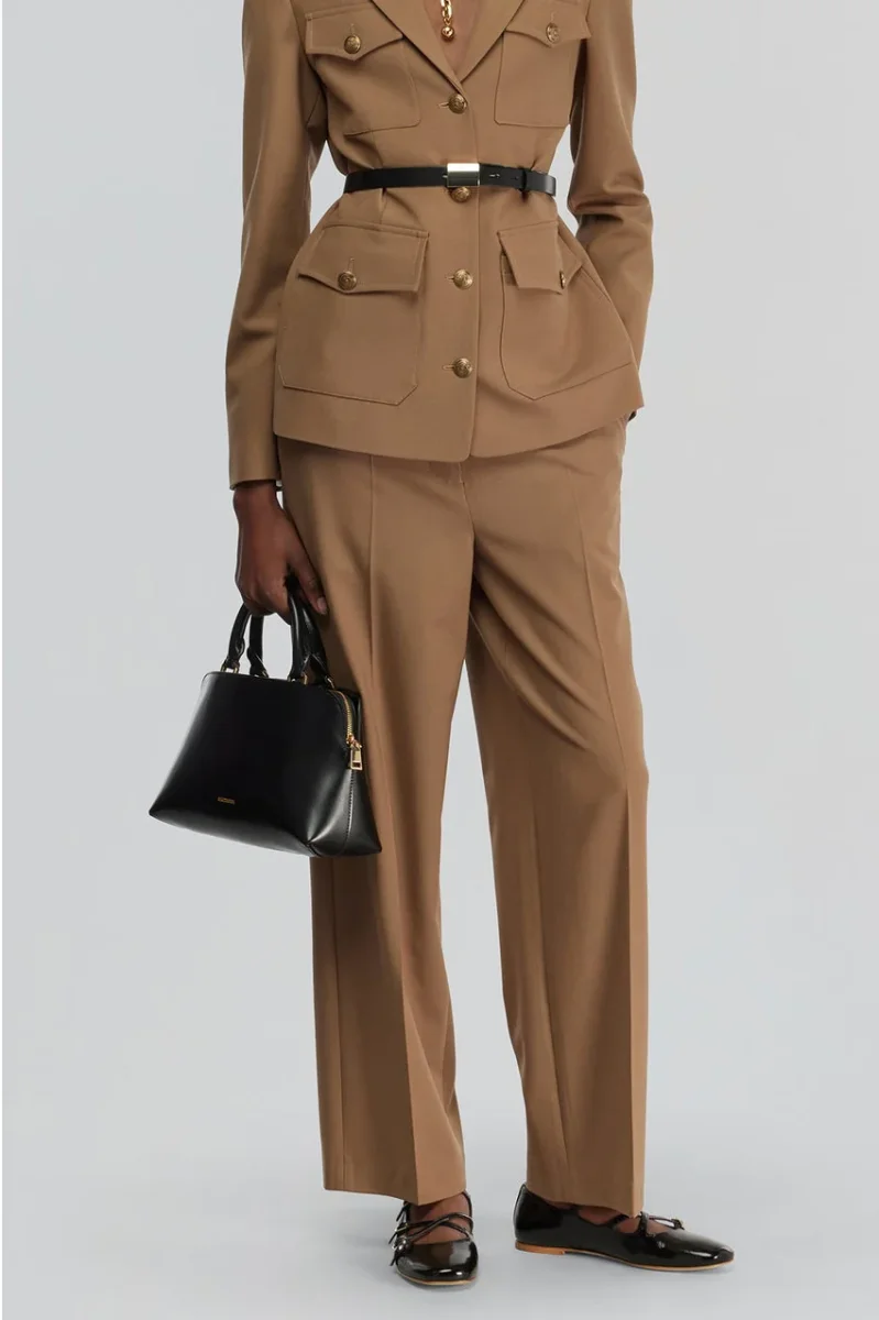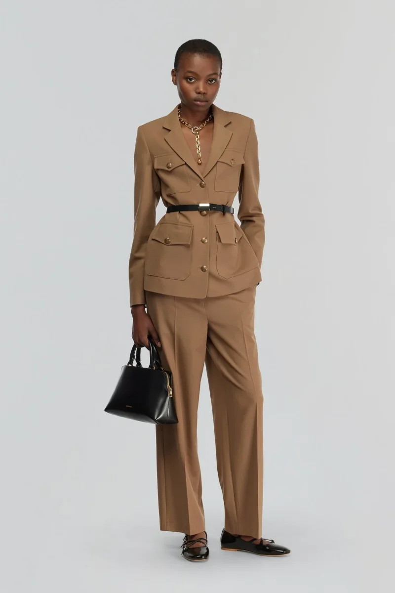 La vestibilità regular valorizza la figura con naturalezza e il tessuto in misto lana stretch garantisce comfort e tenuta della forma per tutta la giornata.