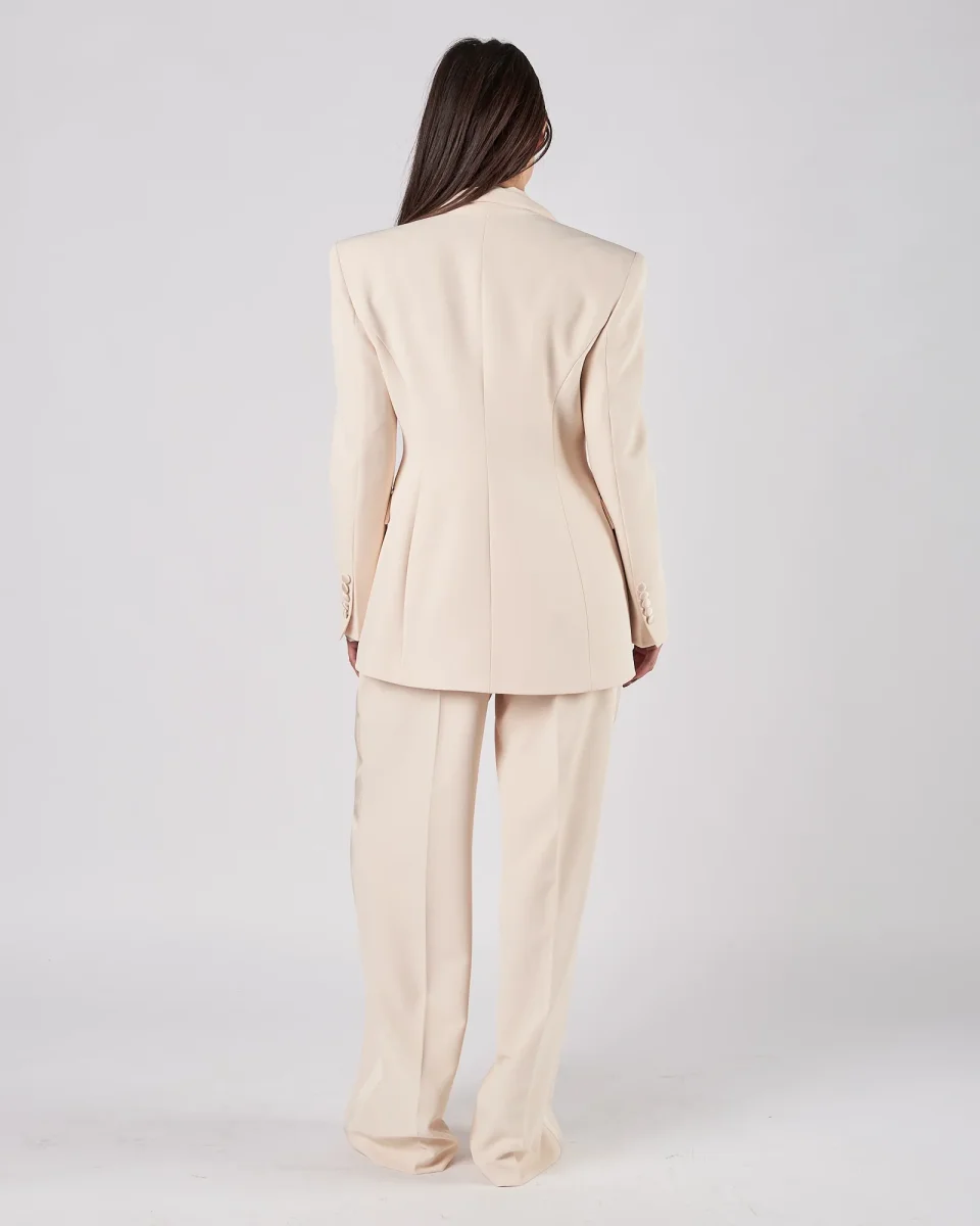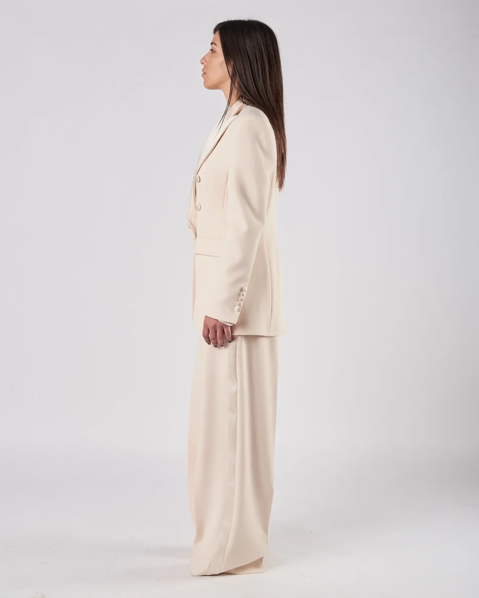 Pantalone crema con banda smoking di raso laterale Chiusra con zip Vestibilità regolare Composizione: 94%poliammide 6%Elastan