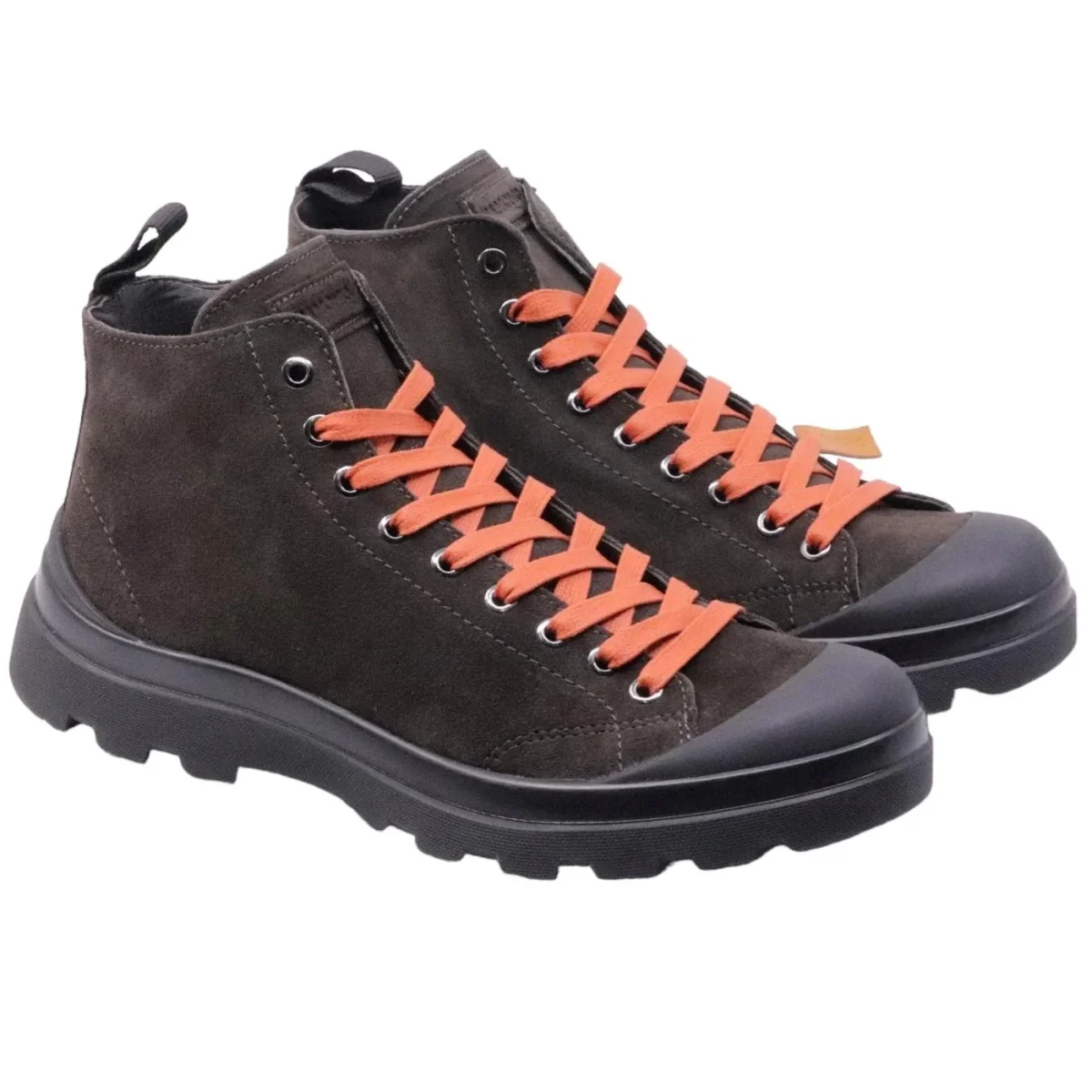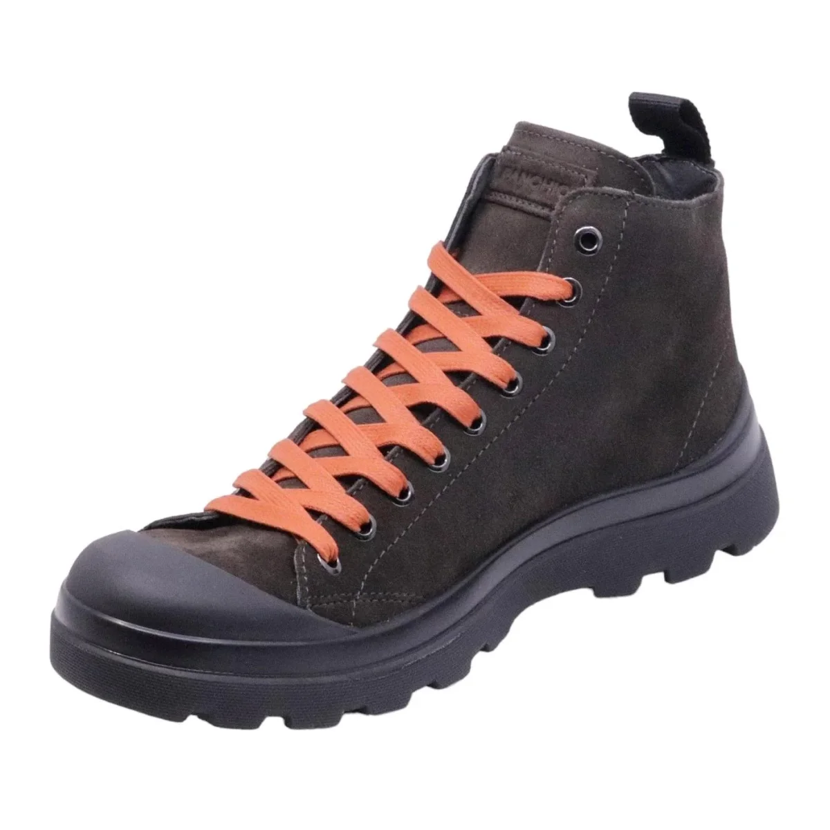 Polacchino uomo Panchic P03 in pelle scamosciata marrone ebano foderato internamente in microfibra. Comodi elastici interni verdi fluo per agevolare i movimenti e fissare la linguetta. Plantare interno estraibile e suola in gomma con un guscio protettivo sulla punta. Made in Italy. Modello P03 M001-00342065 Suede Microfibre Lining Ebony Burnt Orange