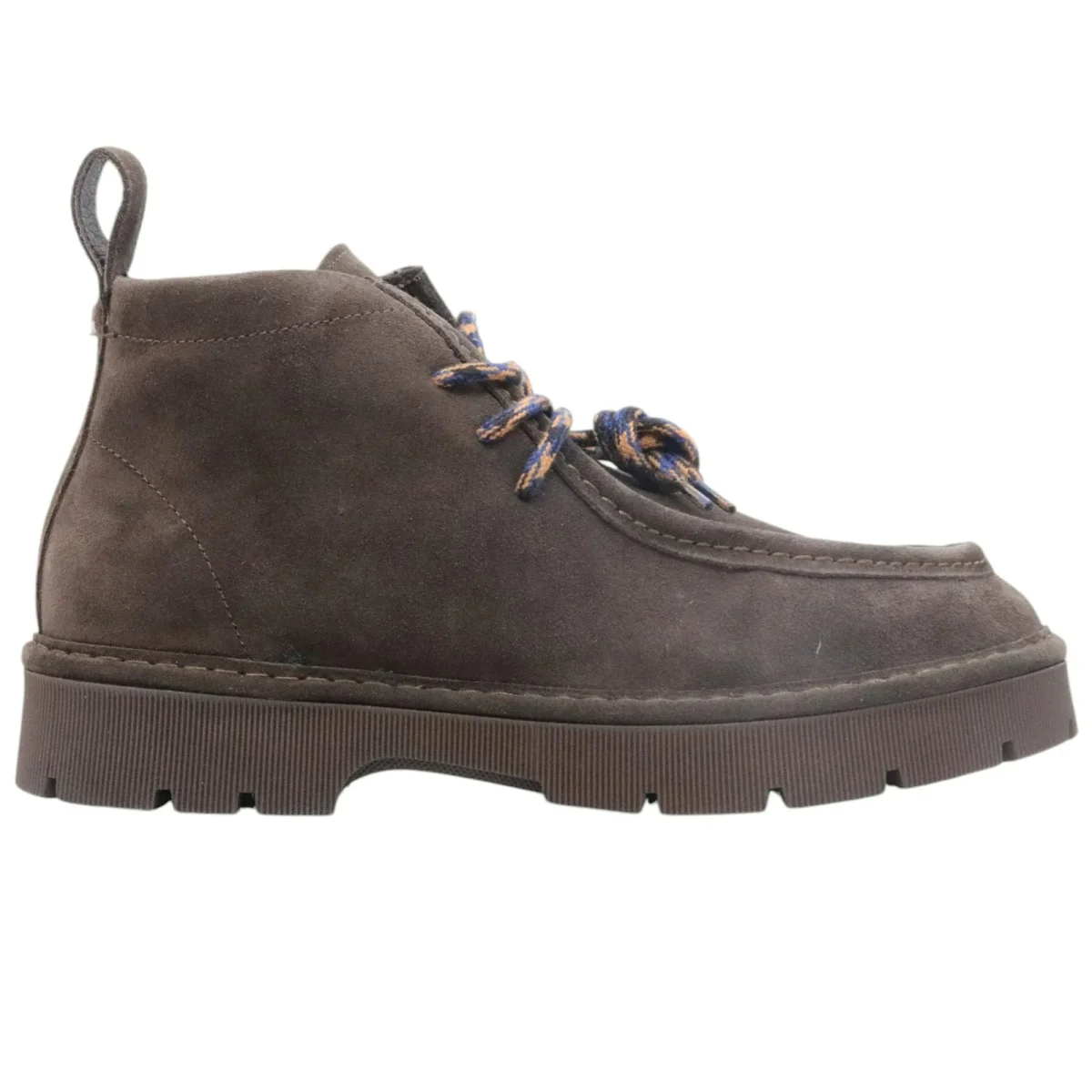 Polacchino uomo Panchic P99 in suede marrone ebano con finiture bordate, ideale per chi cerca un look deciso e contemporaneo. La fodera in microfibra e i lacci tondi tricolore donano un tocco distintivo, mentre la suola millerighe a carro armato aggiunge grinta e robustezza. Il logo è timbrato a caldo in color canna di fucile, e il sottopiede antibatterico estraibile garantisce comfort. Gli elastici interni facilitano i movimenti e fissano la linguetta. Prodotto Made in Italy. Modello P99M007-0093D009 Ebano