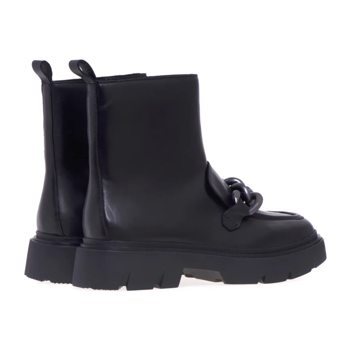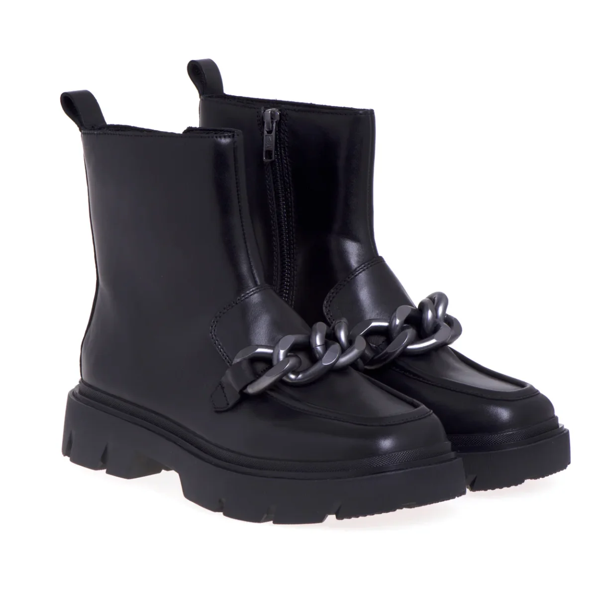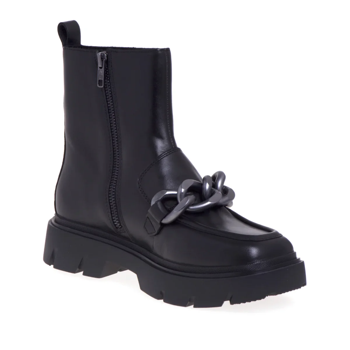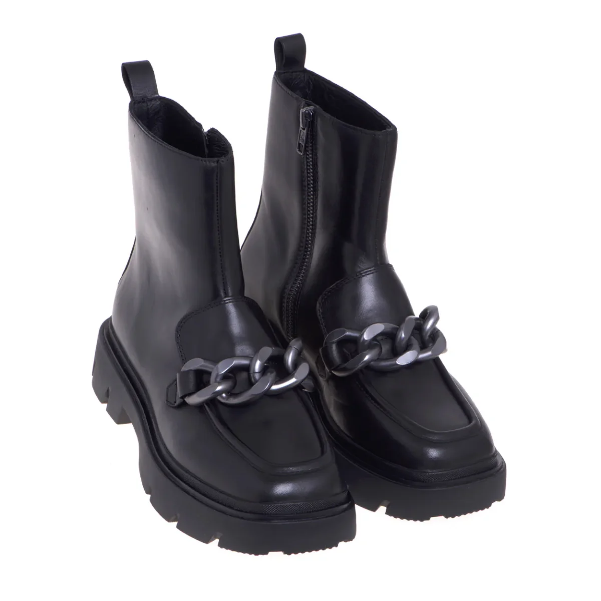 Elementi distintivi del mocassino e del tronchetto impreziositi con una maxicatena in metallo brunito rendono questo polacco la calzatura ideale per chi cerca un accessorio di tendenza in grado di esaltare ogni look. # La zip interna rende agevole la calzata.# Fodera in pelle.# Sottopiede in pelle. # Suola in gomma.