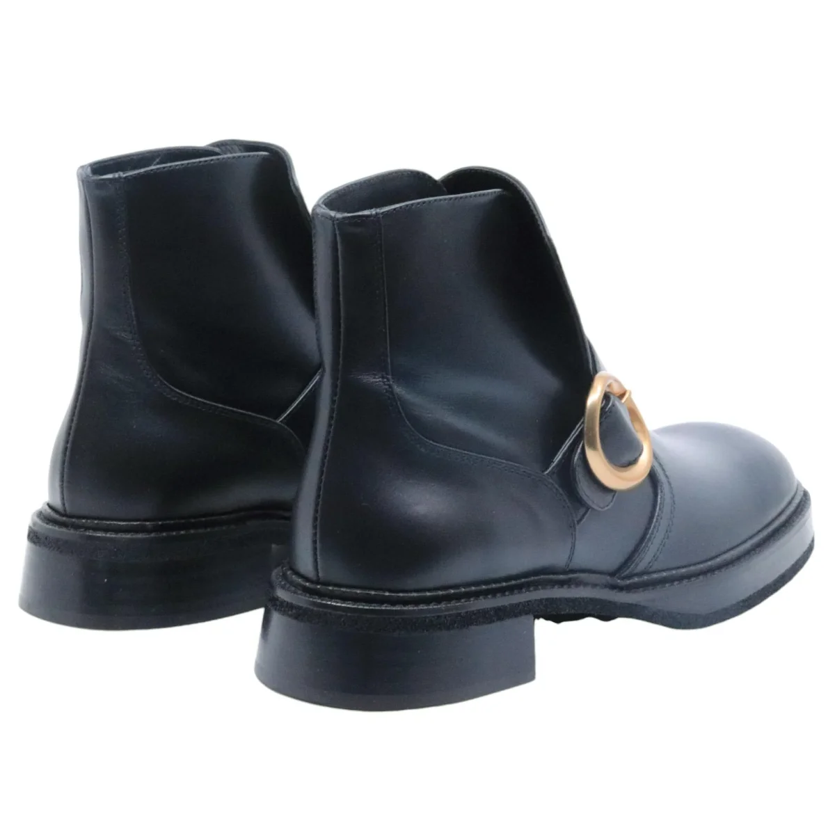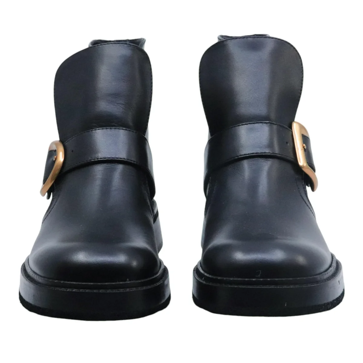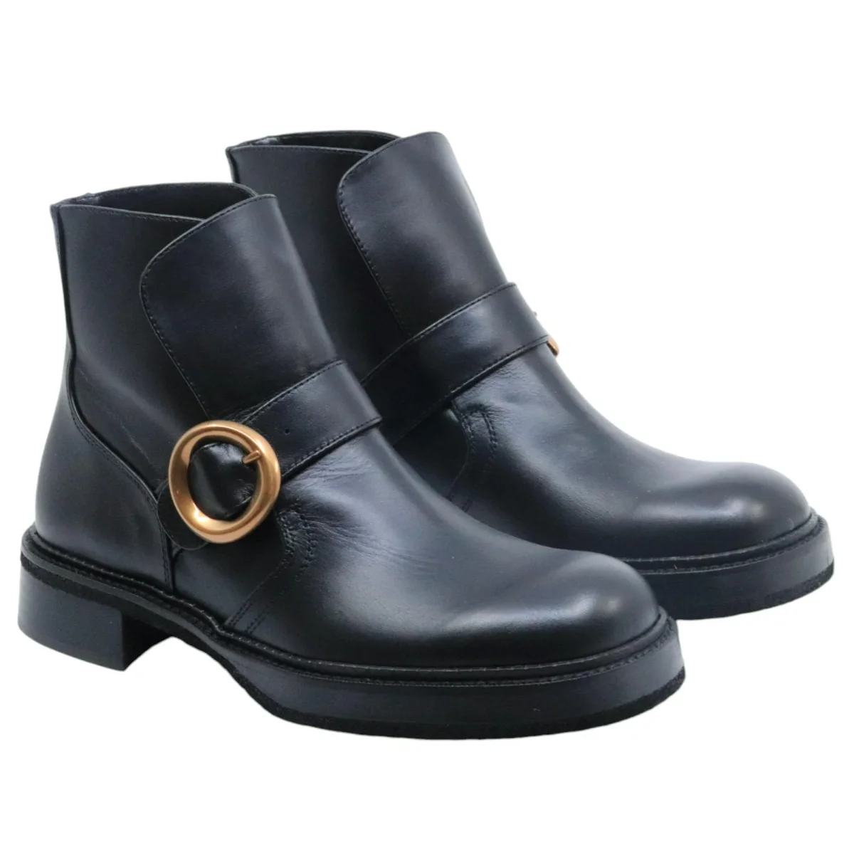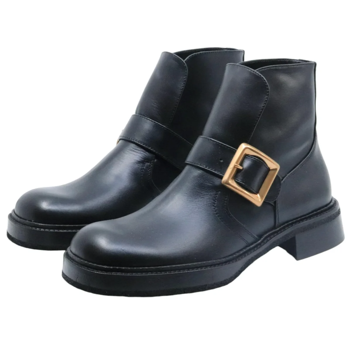 Ras 7857 stivaletto da donna in pelle nera, una scelta di eleganza semplice con un tocco di originalità. Dotato di una fibbia dorata di diversa forma geometrica tra destro e sinistro presenta un tacco di 4 cm e un plateau di 2 cm, con fondo in cuoio e inserto in gomma antiscivolo per un comfort duraturo. Completamente foderato in pelle, è realizzato in Spagna, perfetto sia per giornate intense in ufficio che per serate glamour. Modello 7857 Bully Nero