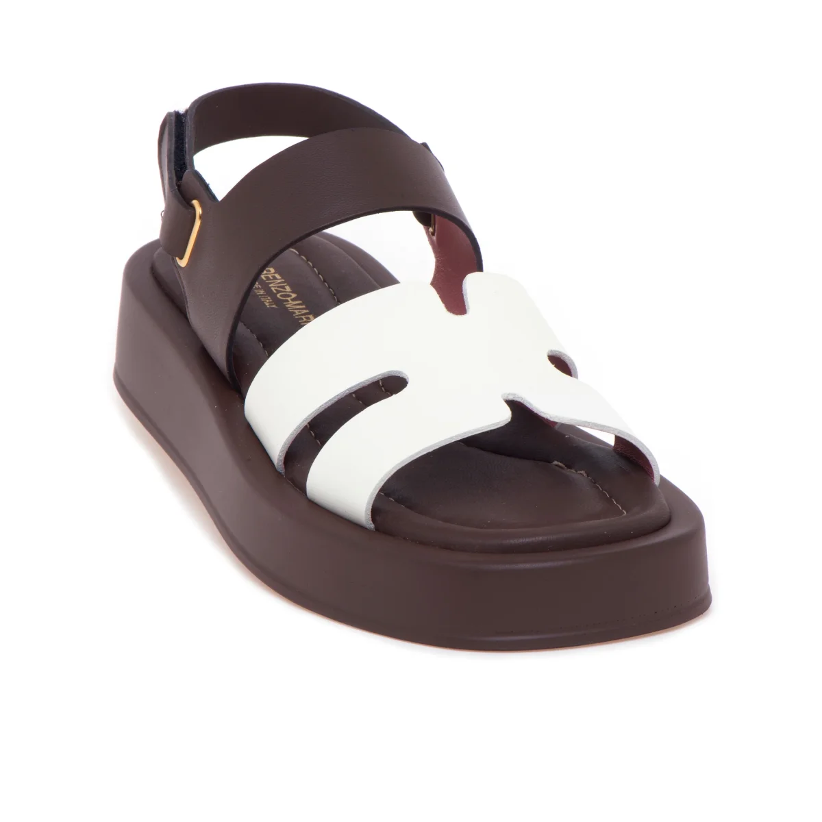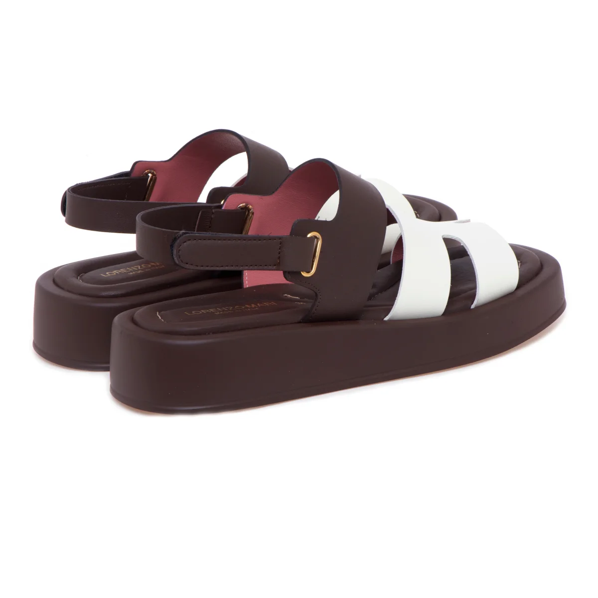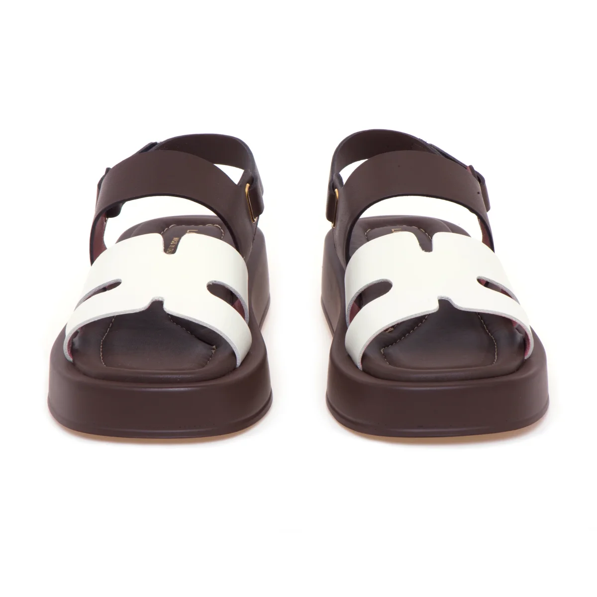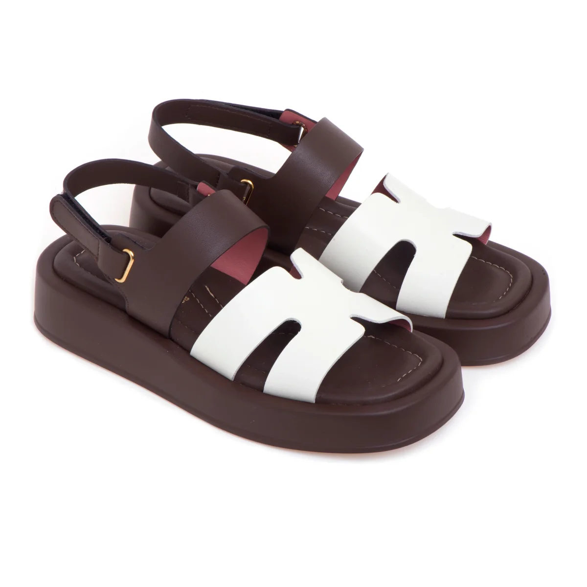 La tomaia in pelle a taglio vivo è composta da una fascia anteriore a forma di “H” in tonalità latte e da una fascia color testa di moro sul collo del piede, a cui si collega il cinturino regolabile con chiusura in velcro.