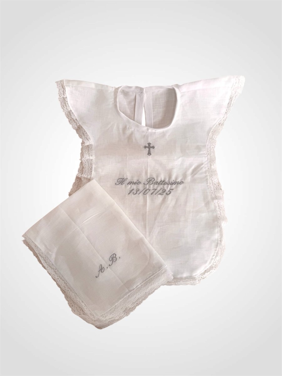 Veste e fazzoletto battesimale personalizzato in puro lino con passamaneria in pizzo intorno