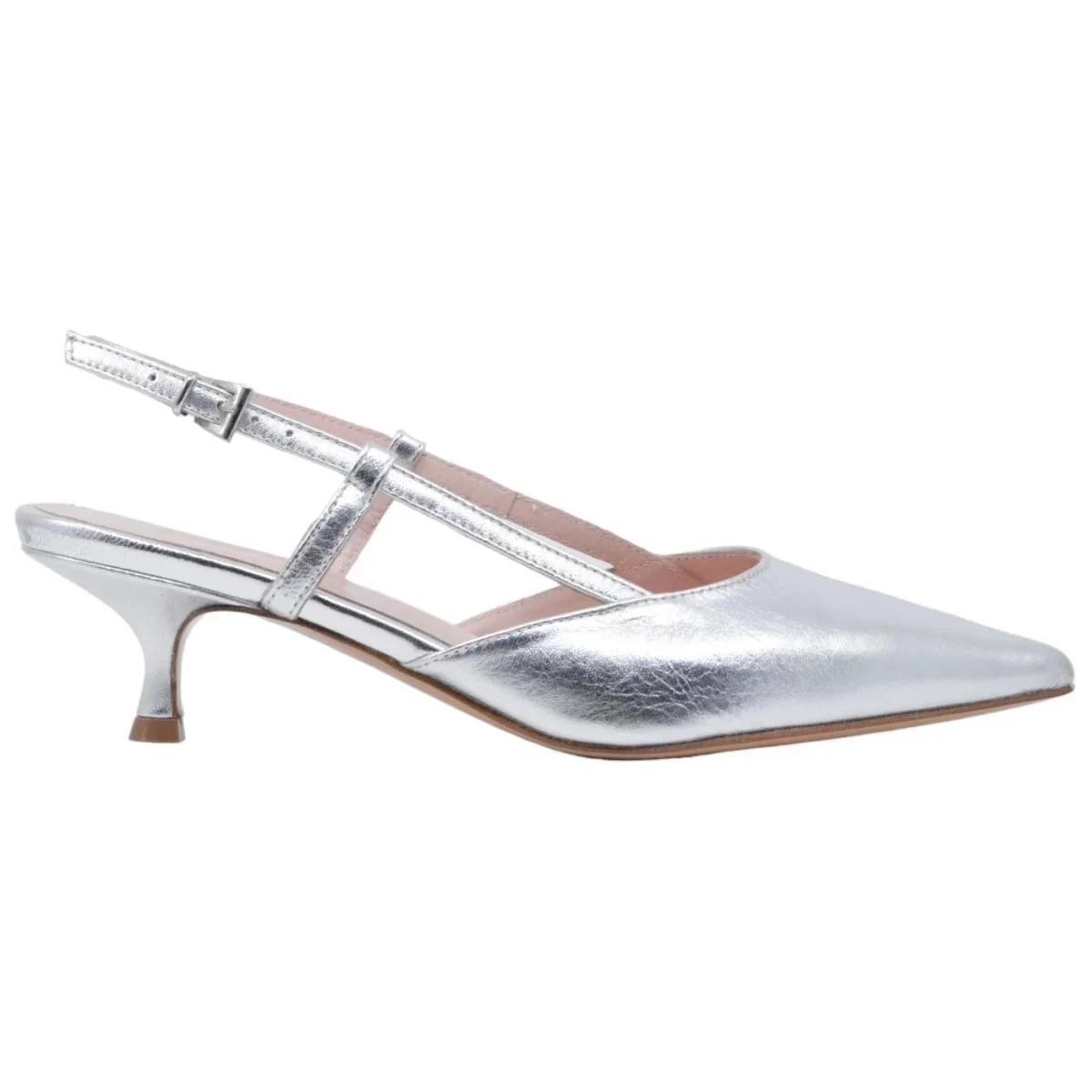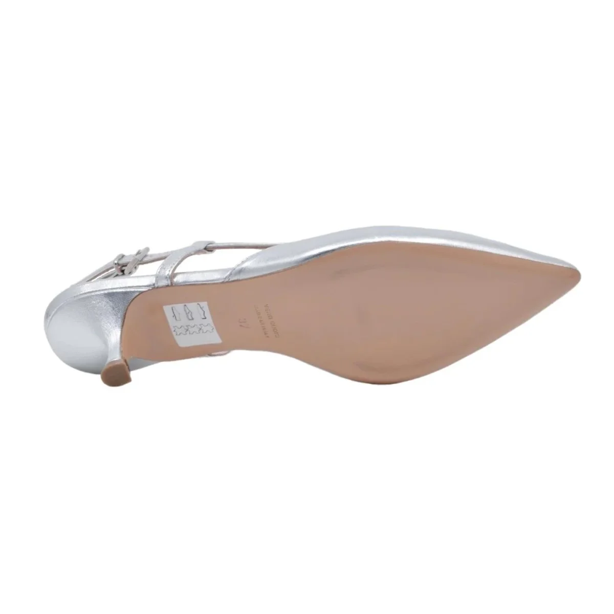 Slingback donna Anna F in pelle lamianta di colore argento. Ottima scarpa per le cerimonie o per le tue occasioni. Pratico cintino regolabile . Plantare imbottito sulla pianta. Il tacco fino è alto 5.5 cm e la suola in cuoio. Modello 1410 Laminato Argento