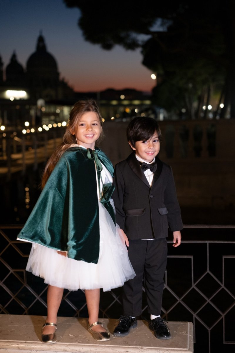 Smoking da bimbo elegante e raffinato, composto da giacca e pantalone in tessuto Tasmania con rever e rifiniture in seta nera lucida, camicia in cotone e papillon coordinato. Un completo perfetto per cerimonie e occasioni speciali, che unisce stile classico e dettagli curati.