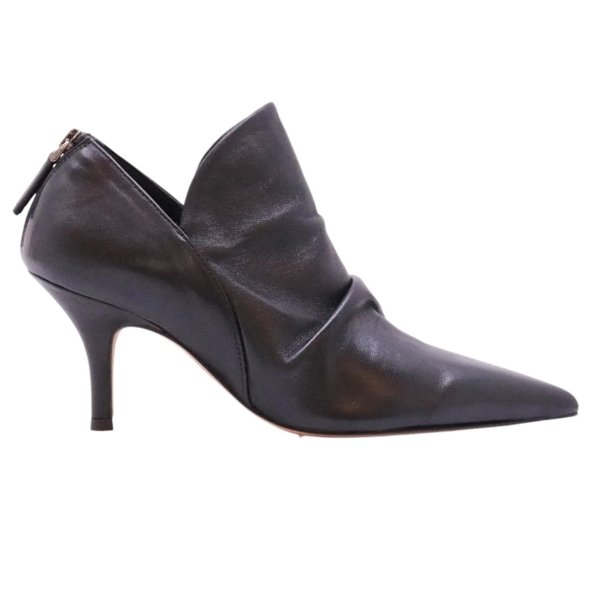 The Seller SE2019 tronchetto donna pelle nero tacco 7,5 cm. Design sofisticato e linea affusolata per il tronchetto The Seller in morbida pelle nera. La tomaia avvolgente con drappeggio dona un effetto elegante e moderno, perfetto per valorizzare ogni look serale o da ufficio. Il tacco a stiletto di 7,5 cm slancia la figura con classe, mentre la zip posteriore facilita la calzata. La suola in vero cuoio garantisce qualità artigianale e comfort. Modello SE2019 Nappa Nero