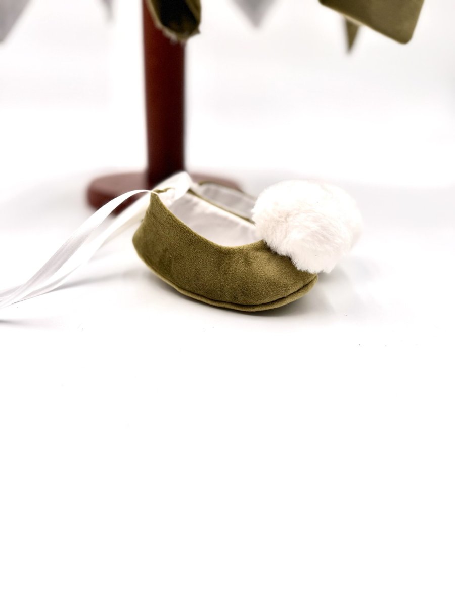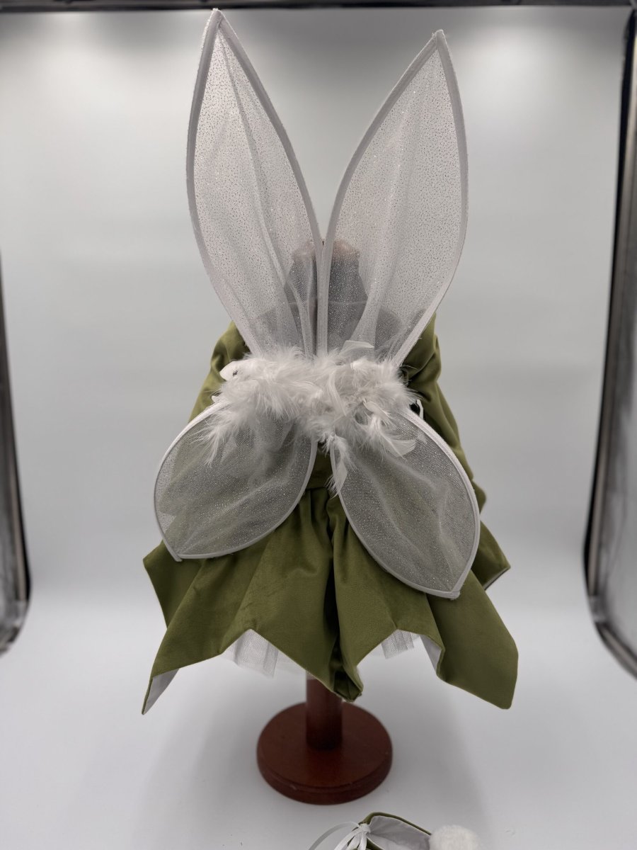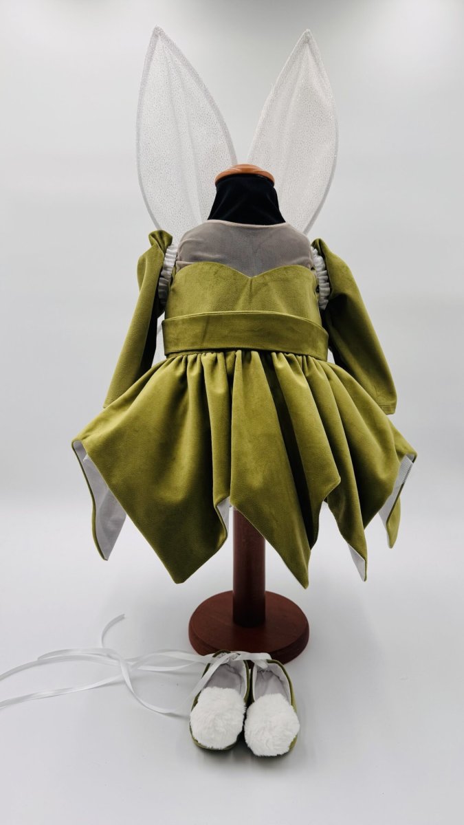 Abito in velluto con scollo a cuore , ali scintillanti , ballerine con pompom