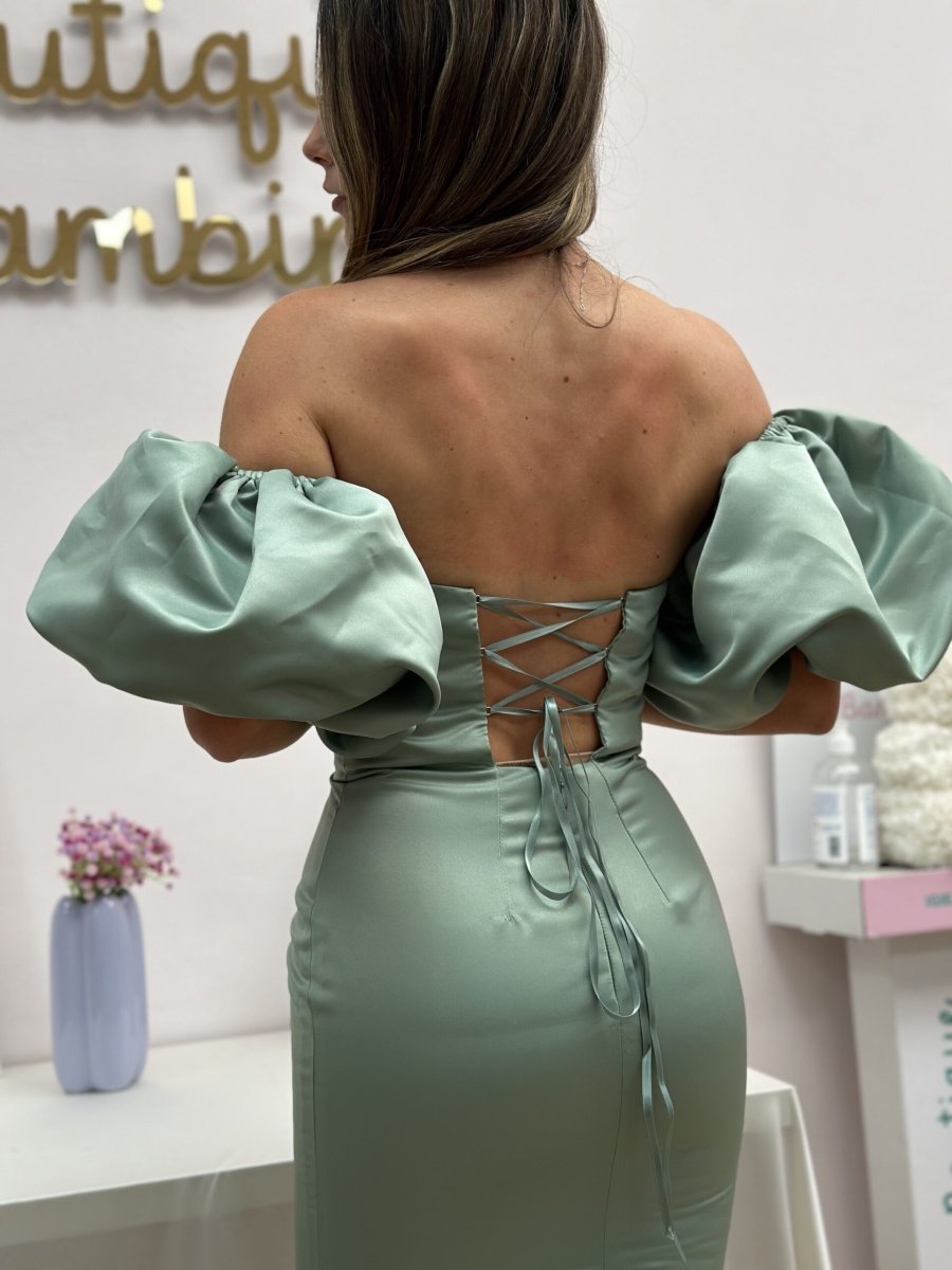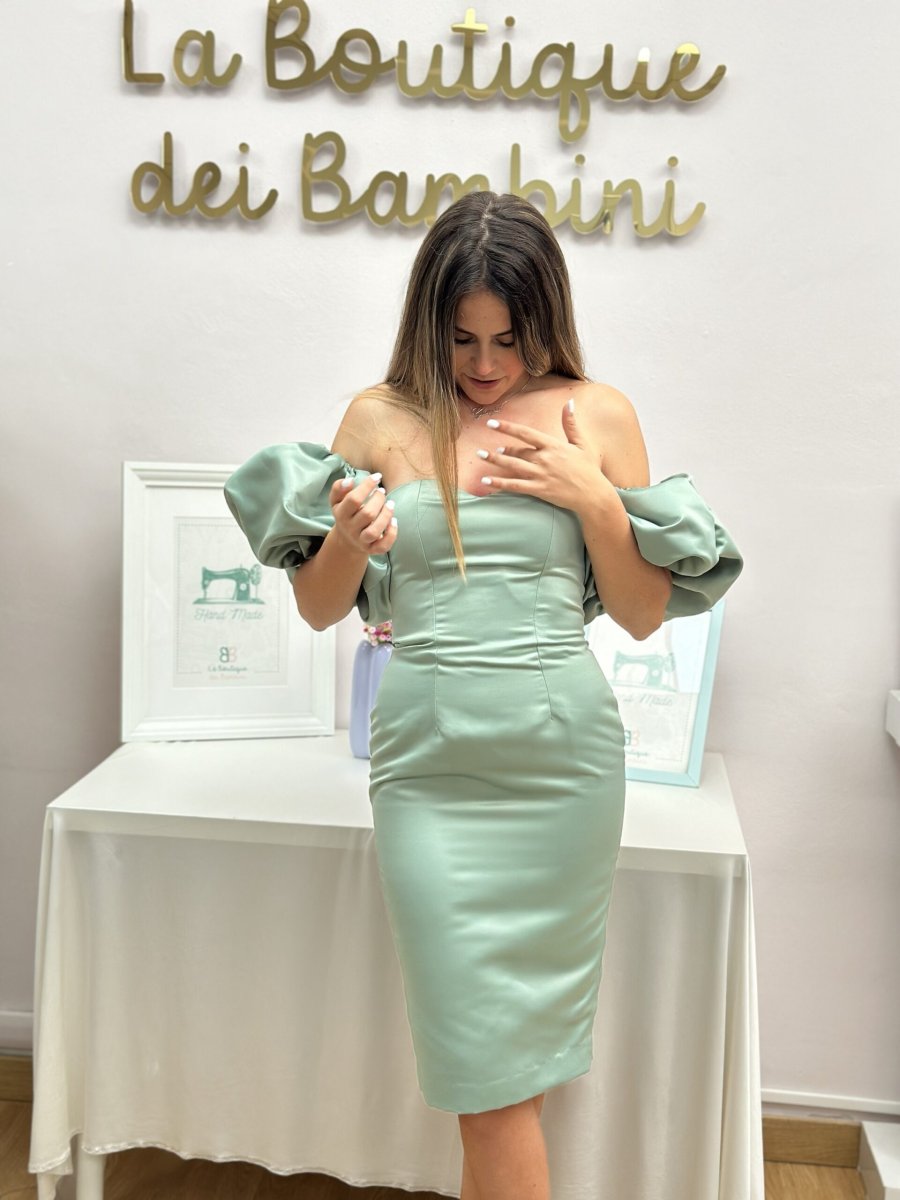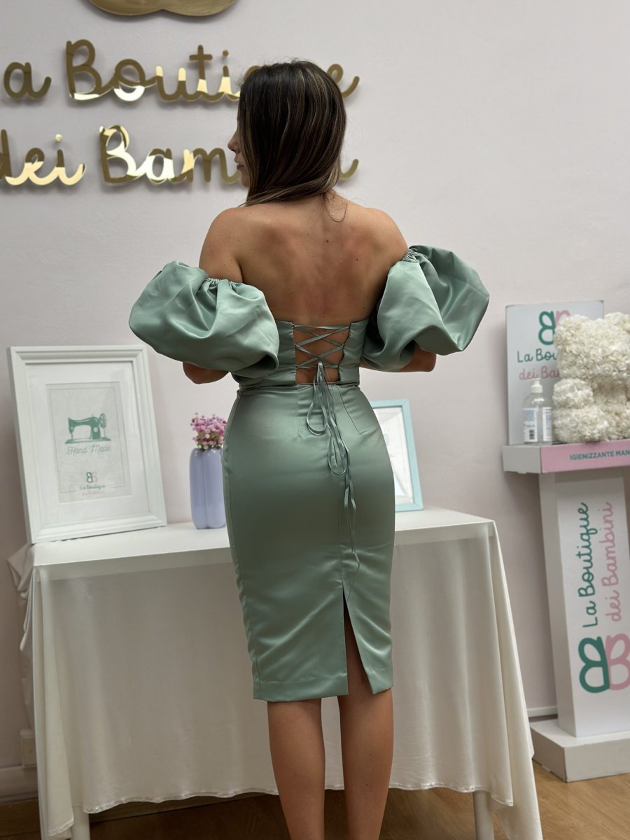 Abito a rubino in duchesse elastica in verde salvia con abbottonatura indietro con stringhe e manicotti rimovibili