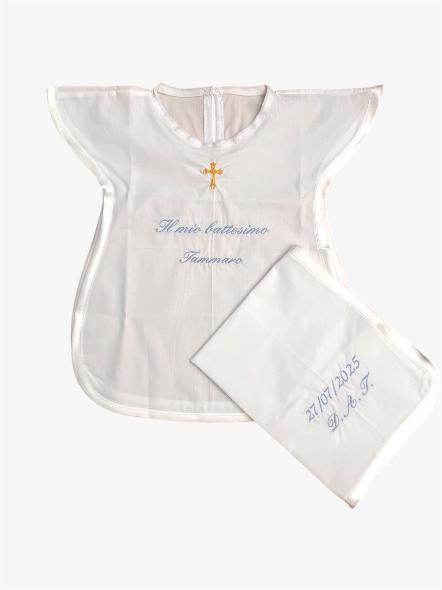 Veste battesimale In cotone e scritta azzurra