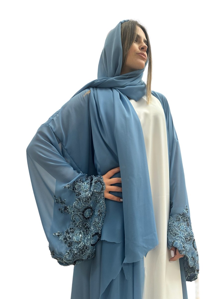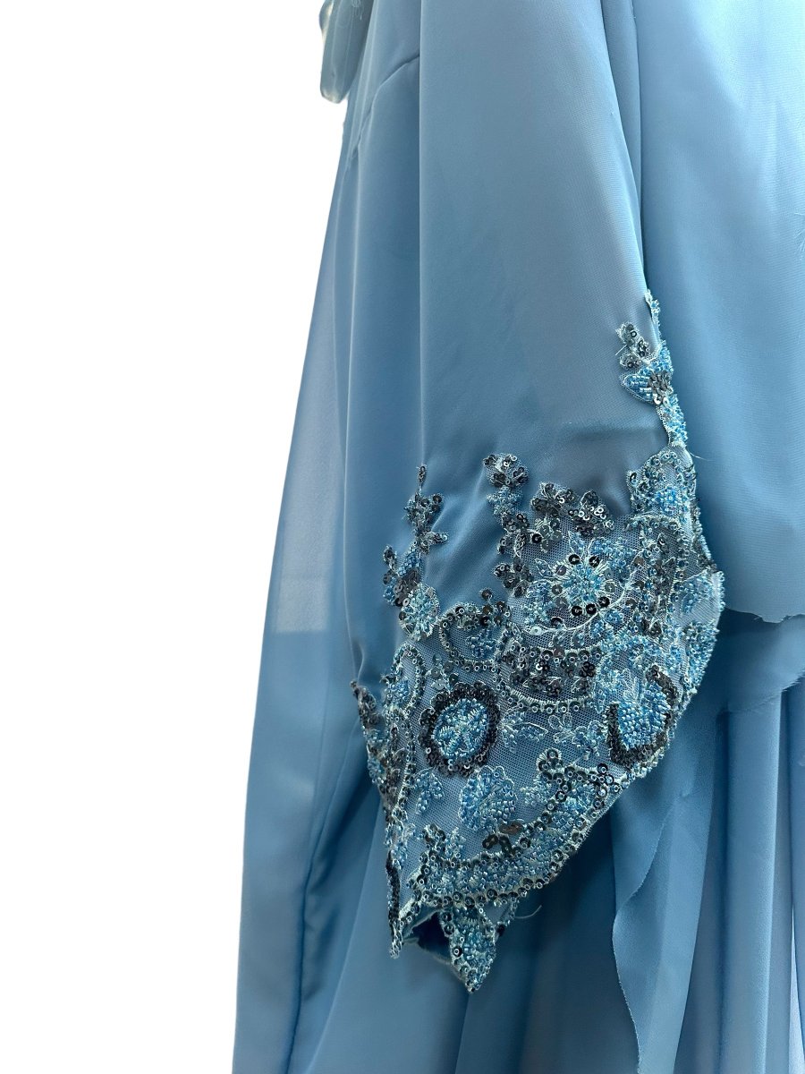 Abito da donna elegante in seta e chiffon con dettaglio alla manica in pizzo e perline, ricamo cucito a mano